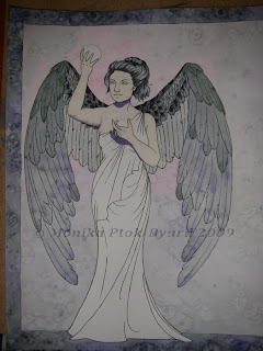 so here I finished the background(which wasn't much)and started with adding some texture to the wings, adding the darker shades to my angel and a light wash to get the feel of what skin tone to use.